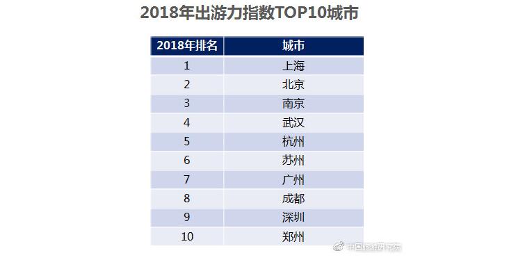 從區域分布來看,出游力指數仍呈現東南沿海地區較高、西北地區較低的局面,但中西部地區出游力指數與東部地區差距有所縮小。2018年全國城市居民出游力指數排名前十位的城市依次是上海、北京、南京、武漢、杭州、蘇州、廣州、成都、深圳、鄭州。(數據說明:城市出游力指數是指該城市居民旅游消費支出占該城市居民消費總支出的比重)
