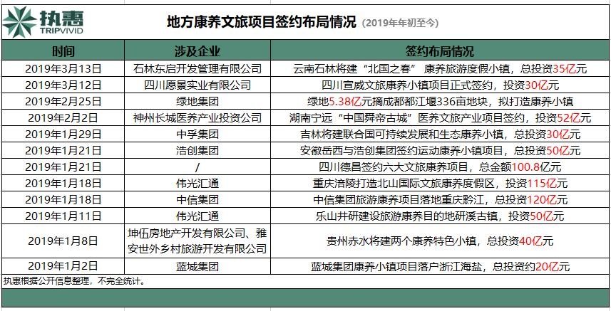 與此同時,地方多個省市康養文旅項目簽約正在提速。執惠統計的信息顯示,2019年年初以來,重慶、云南、四川、湖南、安徽、浙江等地陸續簽約布局康養類旅游小鎮項目,數量高達12起,總簽約金額近650億元,包括綠地集團、藍城集團、中信集團等企業。其中金額最大的要屬中信集團簽約的三塘蓋國際旅游康養度假區項目。今年1月,重慶黔江區政府與中信集團全資子公司——中信正業簽約三塘蓋國際旅游康養度假區項目,總投資達120億元,規劃區面積29平方公里。