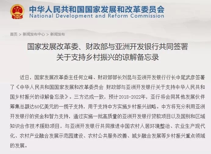 亞洲開發(fā)銀行:國家發(fā)展改革委、財政部、亞洲開發(fā)銀行三方達成一致,預(yù)計 2018-2022 年,亞行將會同其他發(fā)展伙伴籌集總額達 60 億美元的一攬子支持,用于支持中方實施鄉(xiāng)村振興戰(zhàn)略。
