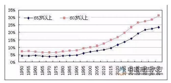 據(jù)資料顯示,中國的老齡化擁有兩個世界第一:一是老齡人口數(shù)量世界第一;二是老齡化速度世界第一。世界上還沒有任何一個國家,老化得像中國這么迅速。預(yù)計到2020年,我國60歲以上老人將超過2.5億,占比為17.5%。2025年,我國60歲以上老人將達到3億,占比為21%,65歲以上老年人比例也將達到13.7%,接近深度老齡化社會,我國將在2027年進入深度老齡化社會。而世界衛(wèi)生組織的預(yù)測,2033年前后中國老齡人口將翻番到4億,到2050年,中國將有35%的人口超過60歲,成為世界上老齡化最嚴重的國家。