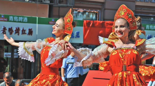 異國風情舞蹈成為中央大街上一道靚麗的風景。 記者蘇強攝