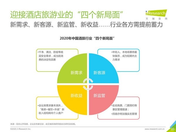 同時,酒店旅游各方從業者也應著眼于中長期變化,提前蓄力,迎接新需求、新客源、新監管、新收益的酒店旅游業“四個新局面”。其中,新需求是指,干凈、清潔、防疫等底層安全需求,成為當前消費的決定性因素;新客源是指,30歲及以下年輕人、本地場景將最快復蘇,成為短期內主力客源需求;新監管是指,實名購票、門票預約等景區精細化管理預計將提速,民宿亦將加強實名管理,新監管要求加強;新收益是指,會議類需求基本消失,“客房+餐飲+外賣”新收入結構轉向個人消費需求為主。