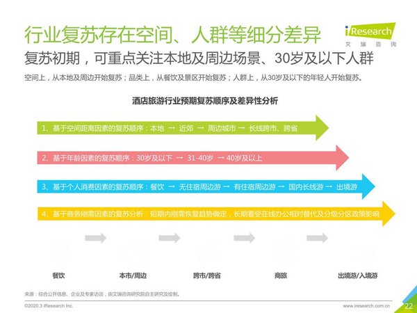 恢復順序方面,空間和人群細分上表現出一定的差異性。空間上,從本地及周邊游開始復蘇;品類上,從餐飲及景區開始復蘇;人群上,從30歲及以下的年輕人開始復蘇。