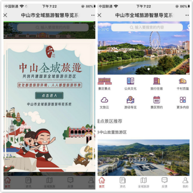 該系統是中山市文化廣電旅游局全力打造的首個以全域旅游概念策劃設計的智慧旅游系統,將景區景點、旅游交通、特色美食、酒店民宿、找停車場、找廁所等食住行游購娛六大旅游元素信息以集成化的系統呈現模式融會貫穿其中。通過此系統,游客與市民可直接了解中山市的文旅資訊信息,為游客與市民提供快捷便利的文旅服務,實現文旅資訊一手掌握。