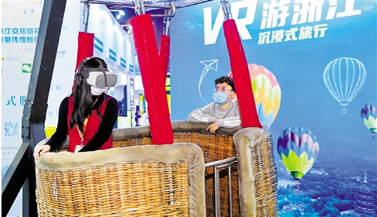 在“VR游浙江”展位,我們又停下了腳步。在工作人員的指導下,坐上了一個實體的熱氣球,完成了一次沉浸式的“空中之旅”。在熱氣球的晃動下,整個人仿佛置身空中,透過VR眼鏡,我們360度欣賞了航拍下的西湖四季風光,耳機里傳來頗具人文底蘊的解說詞,以及徐徐風聲。“還沒在空中看過西湖,文旅加上科技,真是魅力無窮啊。”游客走下熱氣球,紛紛感慨。
