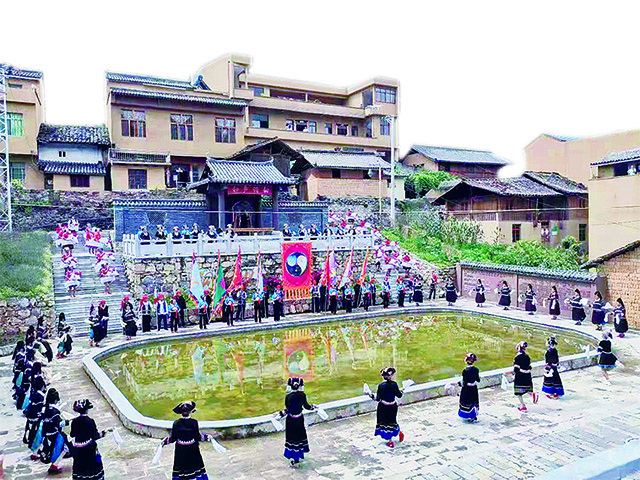 王秉??既∵M士時的答卷,他闡明“乃合天下之大,而業足以蓋之。極萬世之遙,而德足以垂之”的觀點,演藝廳中有一副“三鳥共一嘴圖”,寓意人要尊重自然、保護萬物、和諧共處,現今,這幅圖有了新的寓意:各民族要始終“同呼吸、共命運、心連心”,形同三鳥共一嘴,共同團結奮斗、共同繁榮發展。設立于村子中央的村訓墻,寫著“勤德善仁”的村訓,時刻激勵和鞭策村民們知禮明德,寬厚仁愛,踐行守望相助理念。在神蛙廣場,每逢節日,各族群眾在這里載歌載舞,共度佳節,這里儼然成了各民族交往交流交融的大舞臺。從馬灑的一圖一畫、一磚一木、一屋一景中可以看出,中華民族共同體意識早已融入馬灑人民心中,代代相傳。