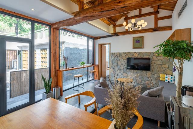 山間一舍是其中的一家。寬敞的院子里,東面的民房是原址翻建,主要是主人用房和共享空間,南北兩排是新建的客房。投資建設者是一對來自沈陽的夫妻。2016年起,投資近600萬元,把民宿建設得有模有樣,有了一定客源。
